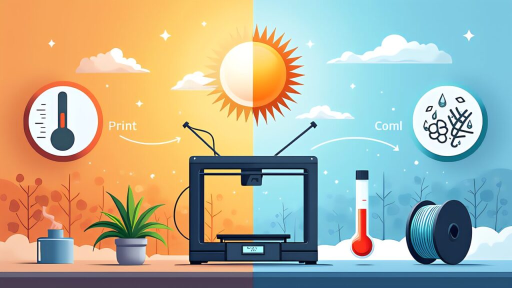 室温は最も影響が大きい外部変数です。具体的には、冬場の15°C以下の部屋ではPLAでも反りが発生します。一方、夏場の高温多湿環境ではフィラメントが吸湿します。つまり、同じ設定でも季節で結果が変わるのです。