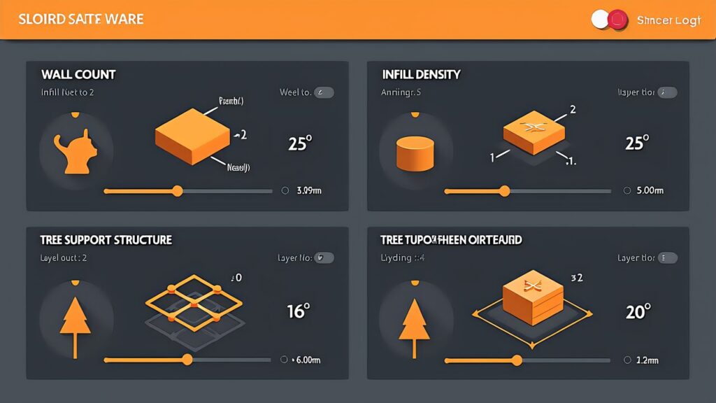 ステップ4:スライス(Slicing)では。Orca Slicerでモデルを読み込み、壁数2以上。インフィル20〜30%(Gyroid)、サポート閾値45度。積層ピッチ0.2mmを基本設定とします。しかし、プレビューで各層を確認してからG-codeを出力します。