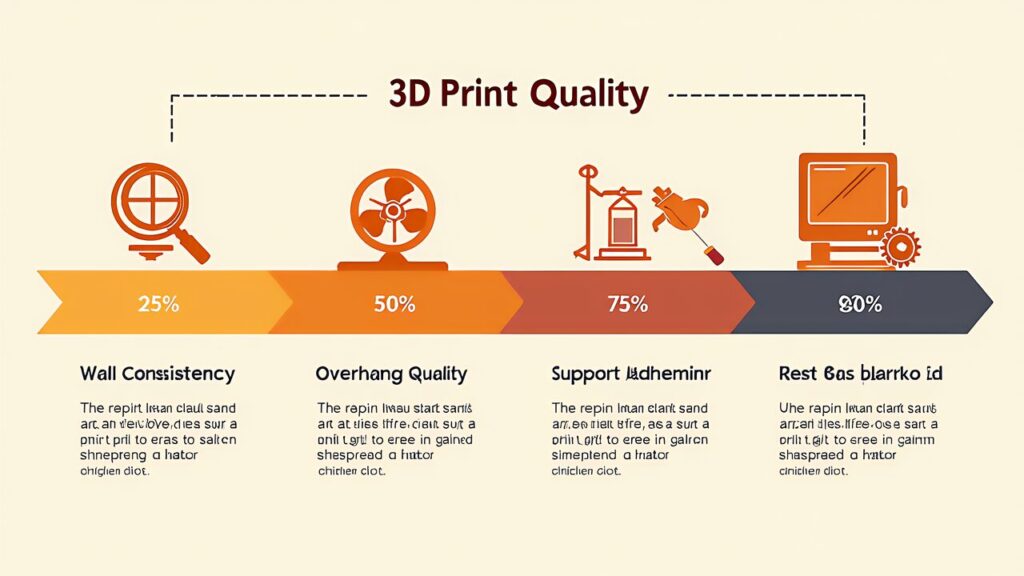 全体の25%到達時点では、壁面の一貫性を確認します。一方、壁が波打っている場合は、印刷速度が速すぎるか、冷却が不足しています。しかし、50%到達時点では、オーバーハング部分の品質を確認します。また、糸引きや垂れが発生している場合、冷却ファンの風量を上げるか。印刷速度を下げます。75%到達時点では、サポート材と本体の接合部を確認します。サポートが本体に融着している場合。サポートの「Zギャップ」を0.1〜0.2mm増やす調整が必要です。