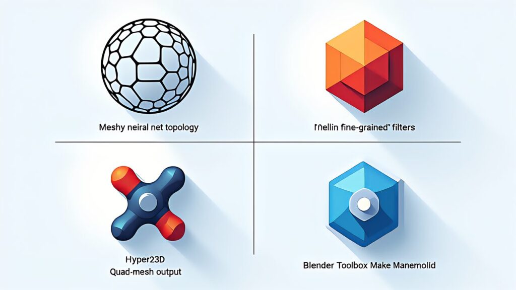 | 主要機能 | AIトポロジー最適化、Low Poly Mode、マルチカラー3Dプリント対応 | Repair Non manifold edges、Close Holes、Quadric Edge Collapse、Poisson Reconstruction | NeRF→Mesh、Image-to-3D、Text-to-3D、Quad-meshトポロジー出力 | Make Manifold(穴埋め+非多様体修復統合)、Hollow、メッシュ体積/表面積、エッジ検証 |