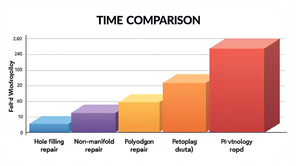 非多様体修復: 自動修復で数秒〜数十秒(メッシュサイズ依存)。重大な構造破綻は手作業10分〜1時間。再スキャンの方が早い場合もある。