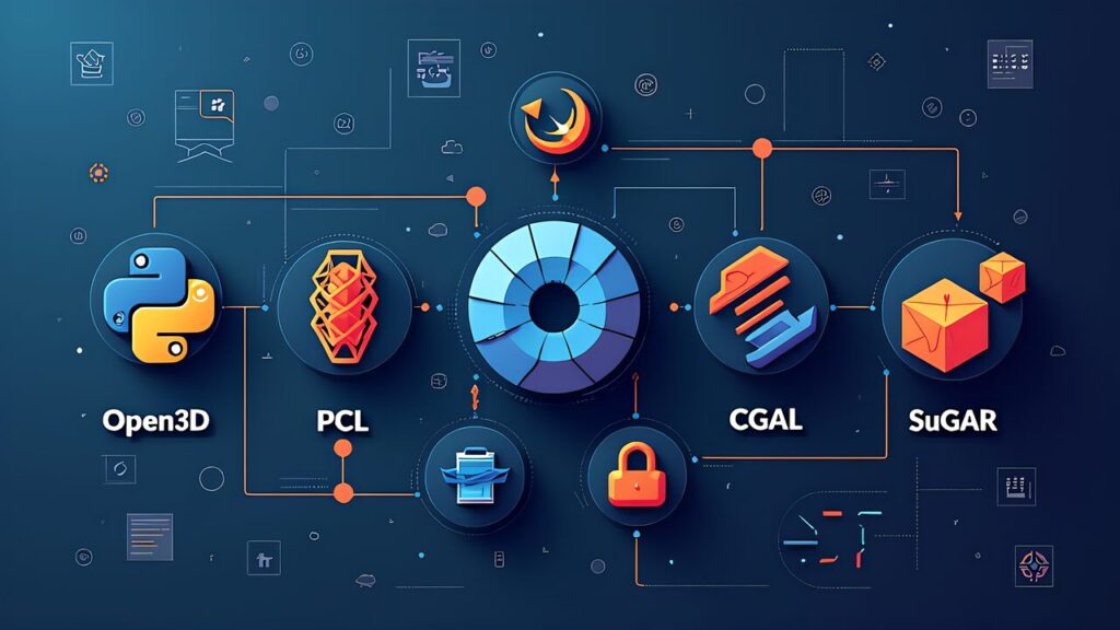 AI メッシュ修復のオープンソース実装は2026年時点で多数存在する。Open3D(Intel開発)、PCL(Point Cloud Library)、CGAL(Computational Geometry Algorithms Library)、PyMesh などのライブラリを組み合わせれば、独自パイプラインを構築できる。GitHub には SuGaR、2DGS の実装も公開されており、Gaussian Splattingからのメッシュ抽出を自社サーバで動かすことも可能だ。Open3D は Python・C++ 両対応で深層学習統合(ML in 3D)も視野に入る設計で、研究と商用の橋渡しに向いている。