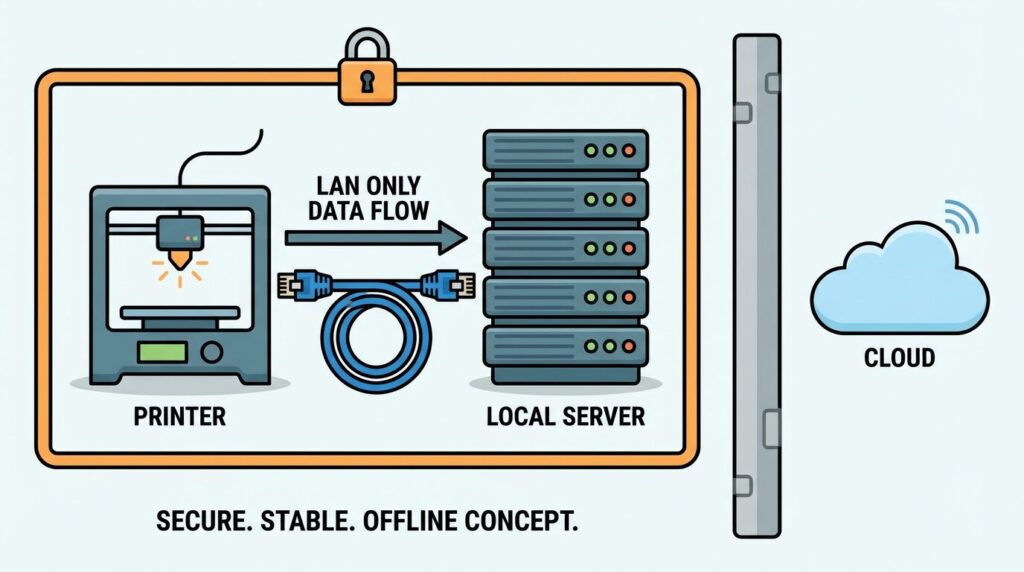 このモードでは、プリンターはメーカーのクラウドサーバーと一切通信しません。