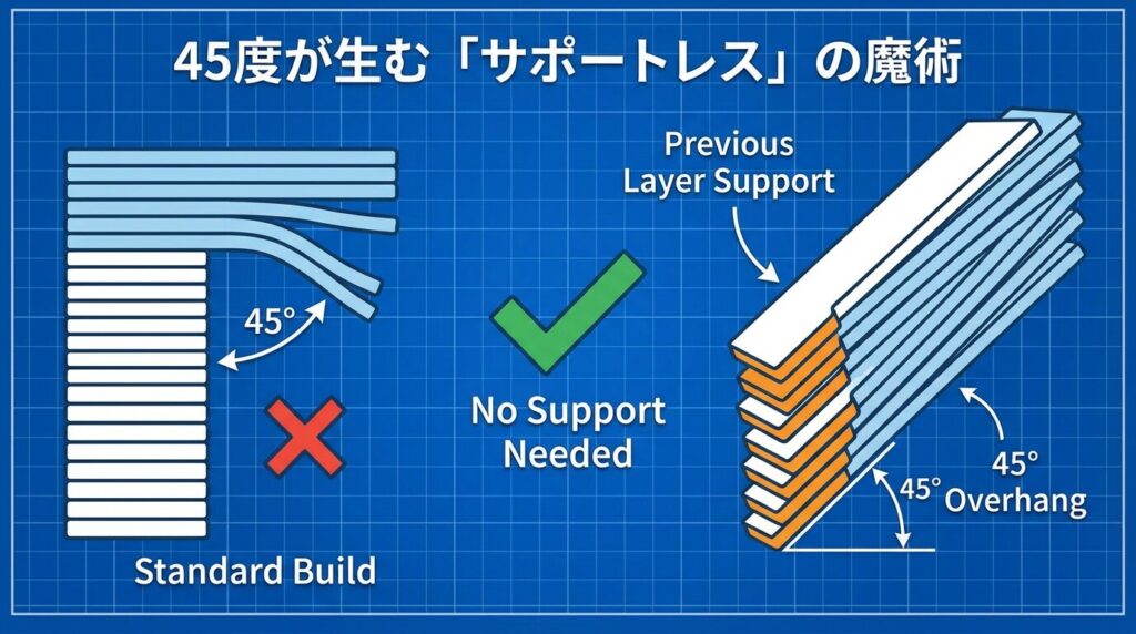 通常、空中に浮いた形状(オーバーハング)には「サポート材」が必要ですが、45度傾いていることにより、