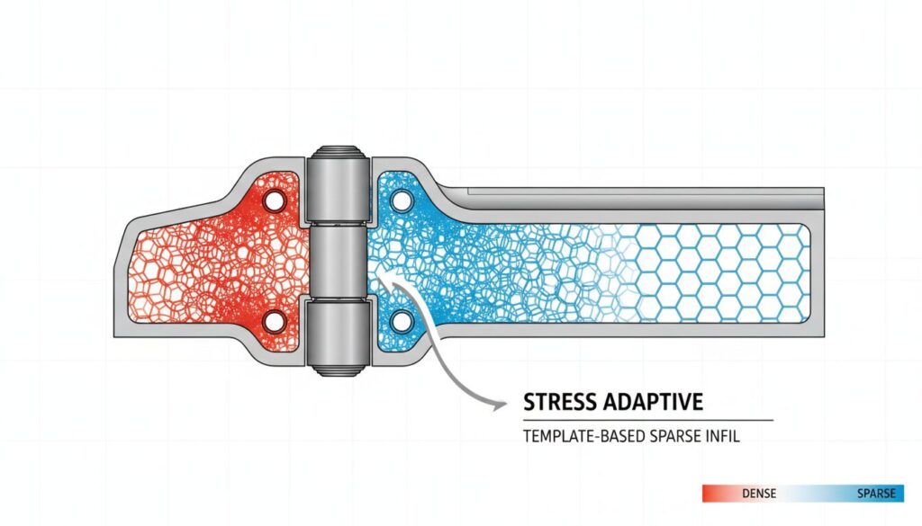 - After (2.3.1): 力がかかるヒンジ部分だけ「ジャイロイド密度40%」にし、他は「ライトニング5%」にする、といった局所的な密度とパターンの回転を自動化できます。