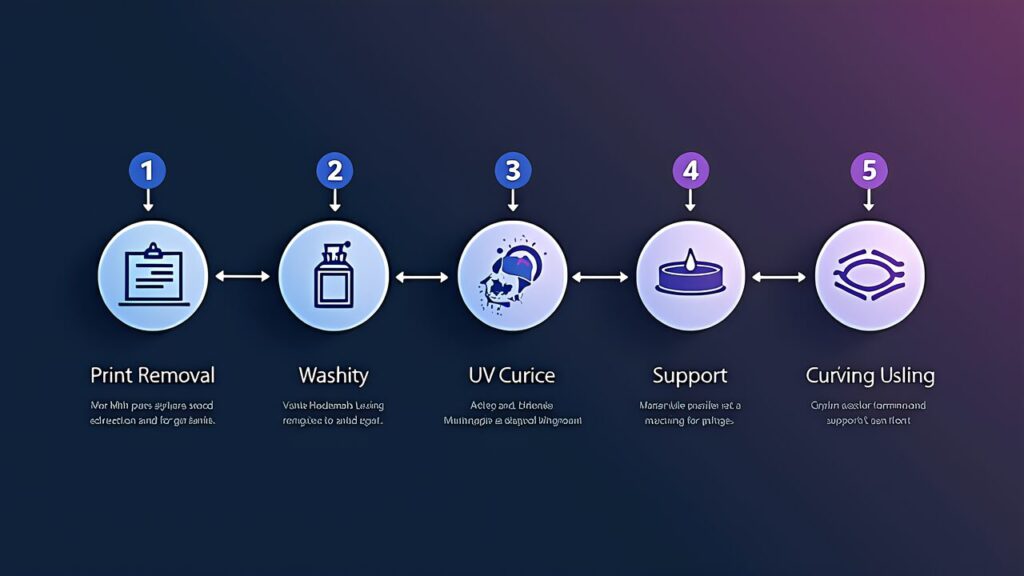 レジン3Dプリント 後処理 洗浄 UV硬化 2026の基本は、5つのステップで構成される。この順序を守ることが、安定した品質を得るための前提条件だ。