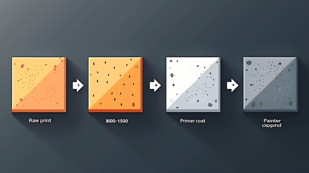 番手の順序は400→800→1500が基本だ。400番でサポート痕や大きな凹凸を除去し、800番で中程度の傷を消し、1500番で最終的な滑らかさを出す。鏡面仕上げが必要な場合は、2000番以上のペーパーやコンパウンドを使用する。