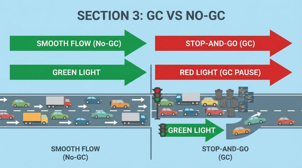 Go や Java では避けられない “Stop-the-world” が Rust にはありません。